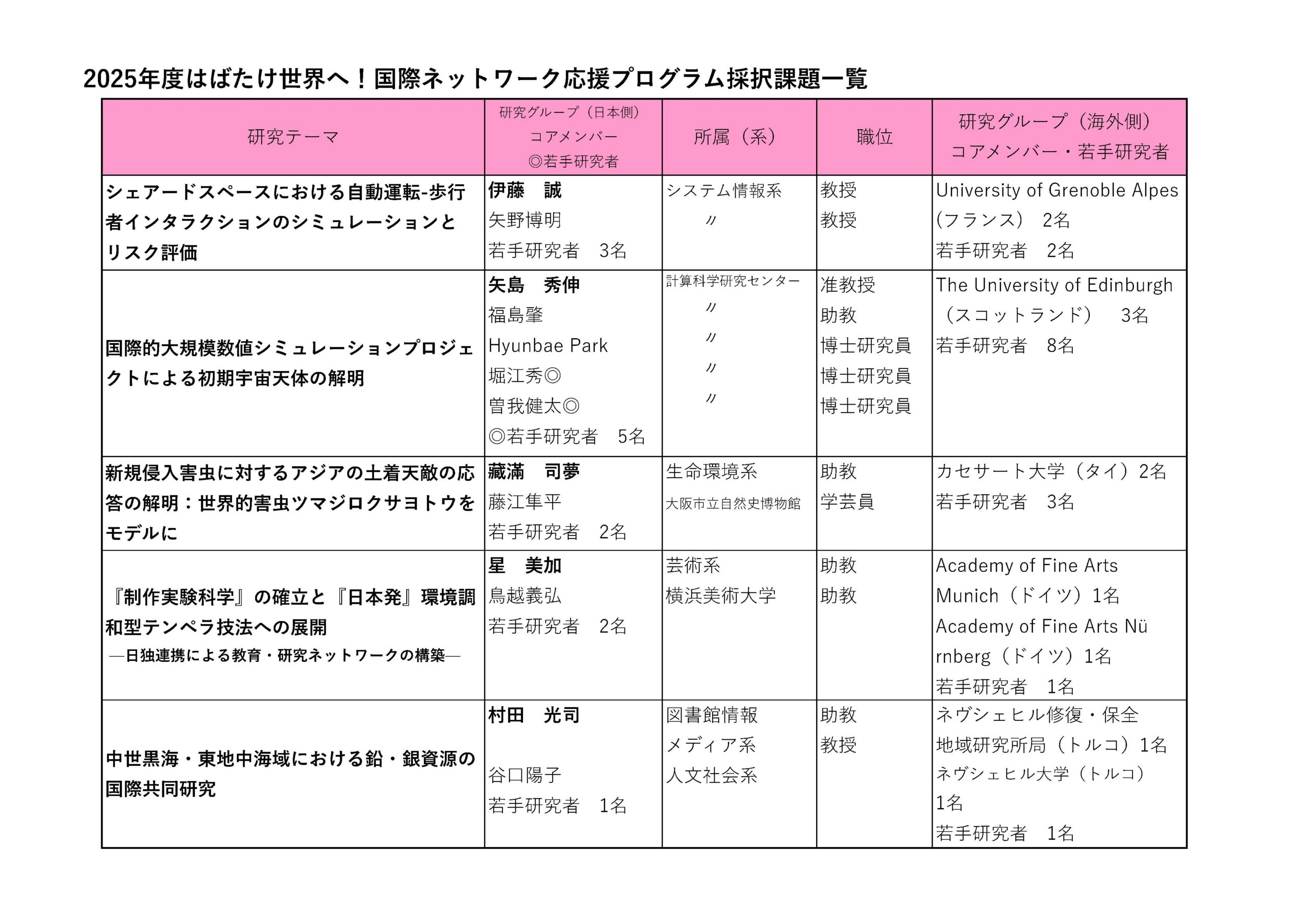 - 若手研究者(大学院生などを含む)2名以上(日本側1名以上、海外側1名以上)