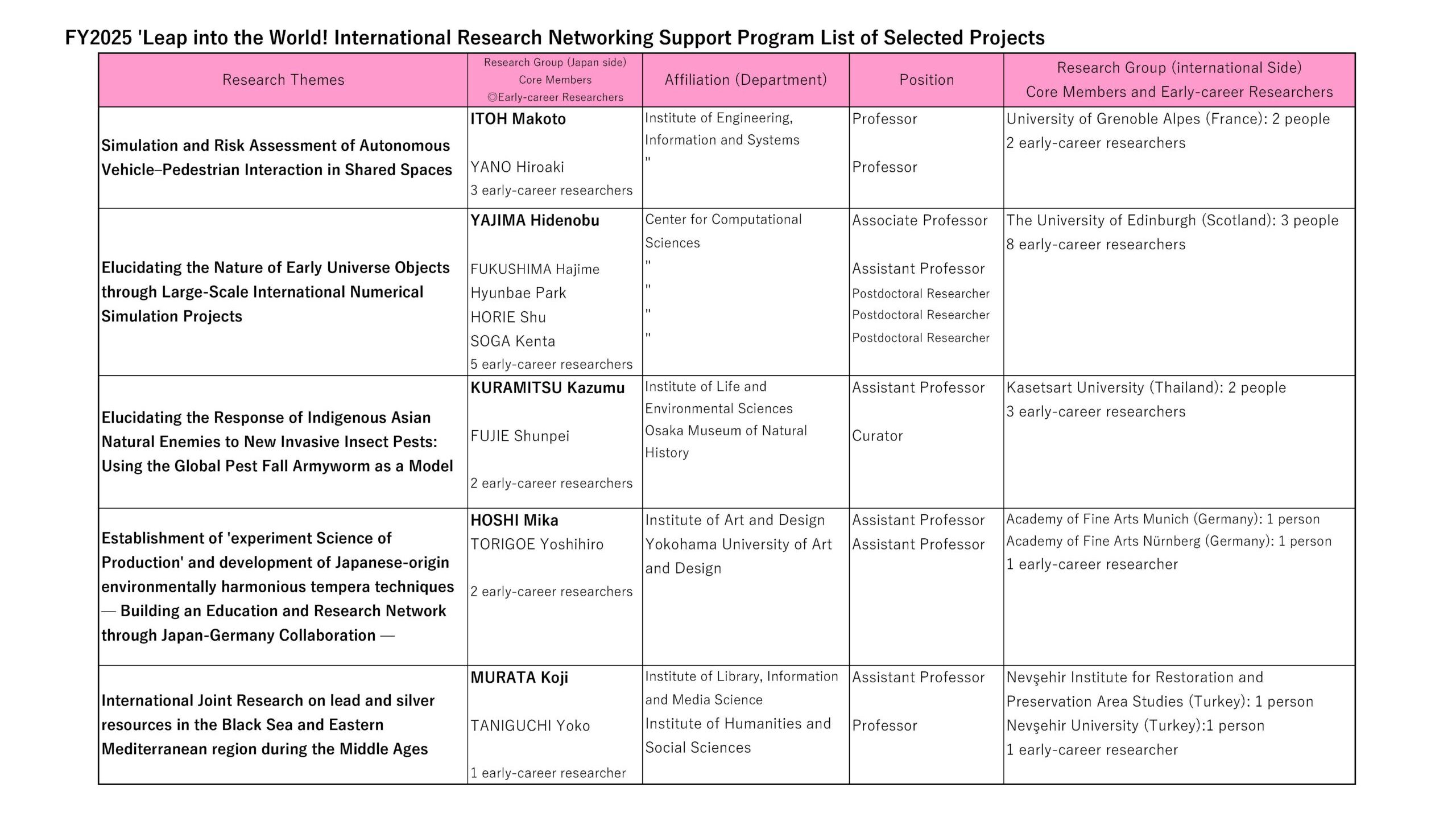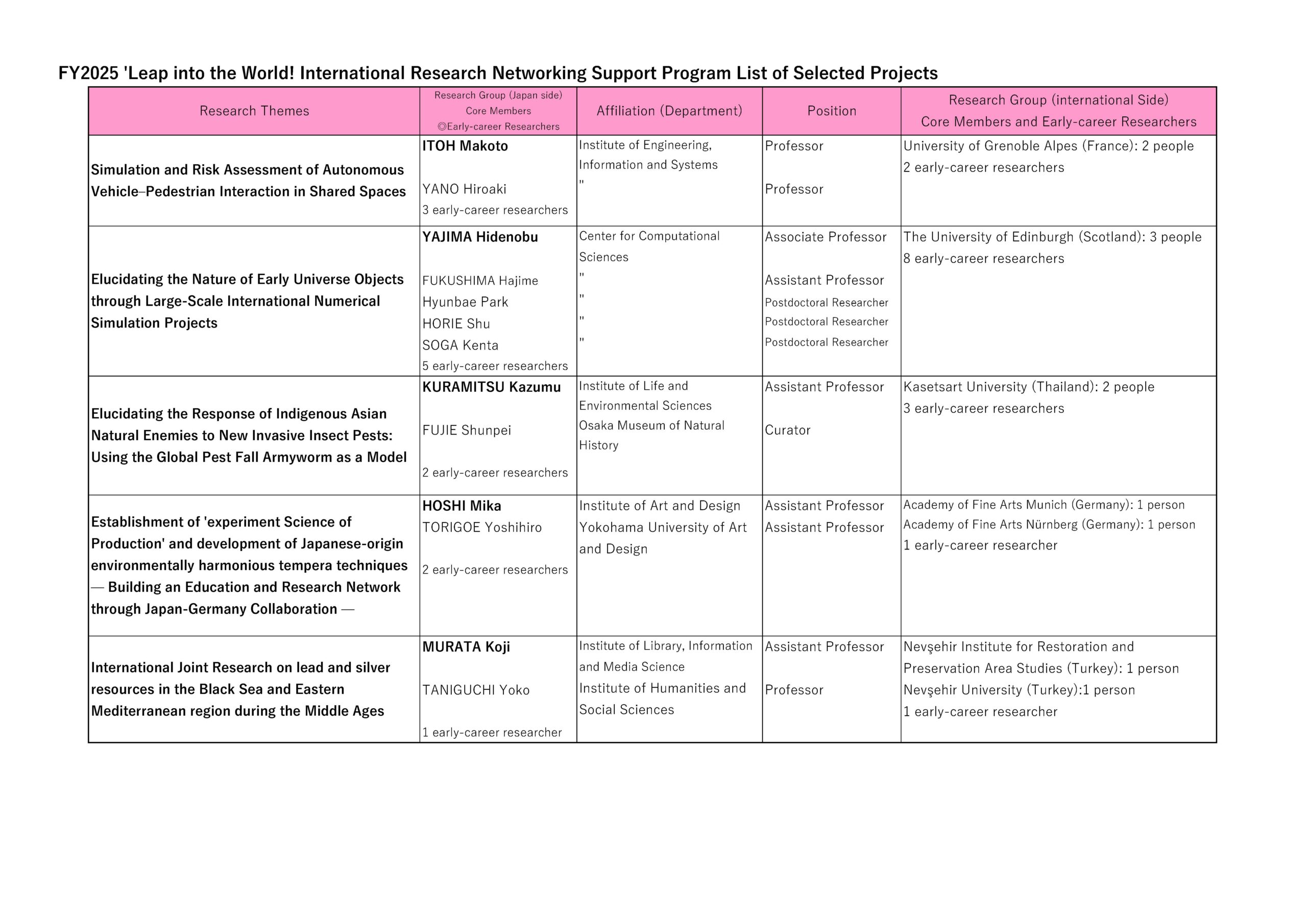This program, established through the Daiichi-Sankyo “Habataku” Support Program for the Next Generation of Researchers, aims to accelerate the development of international collaborative research networks at the University of Tsukuba and foster new synergies across diverse basic research fields. Its objectives include the creation of international joint research projects, increased publication of high-quality co-authored papers, and long-term contributions to solving global challenges.